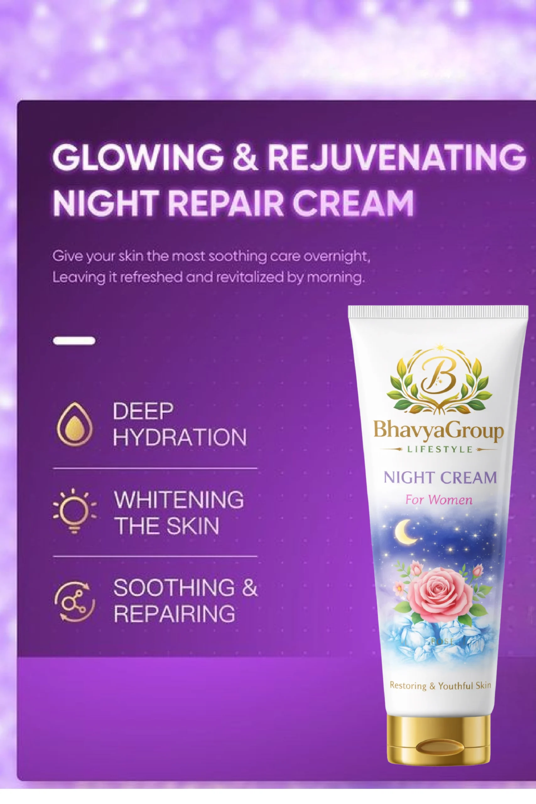 While you sleep, your skin goes into “repair mode.” Help it reach its full potential with the BhavyaGroup Lifestyle Rose Night Cream. This advanced overnight treatment is designed to deeply nourish and restore your skin’s natural beauty while you rest, so you can wake up every morning with a refreshed, youthful glow.